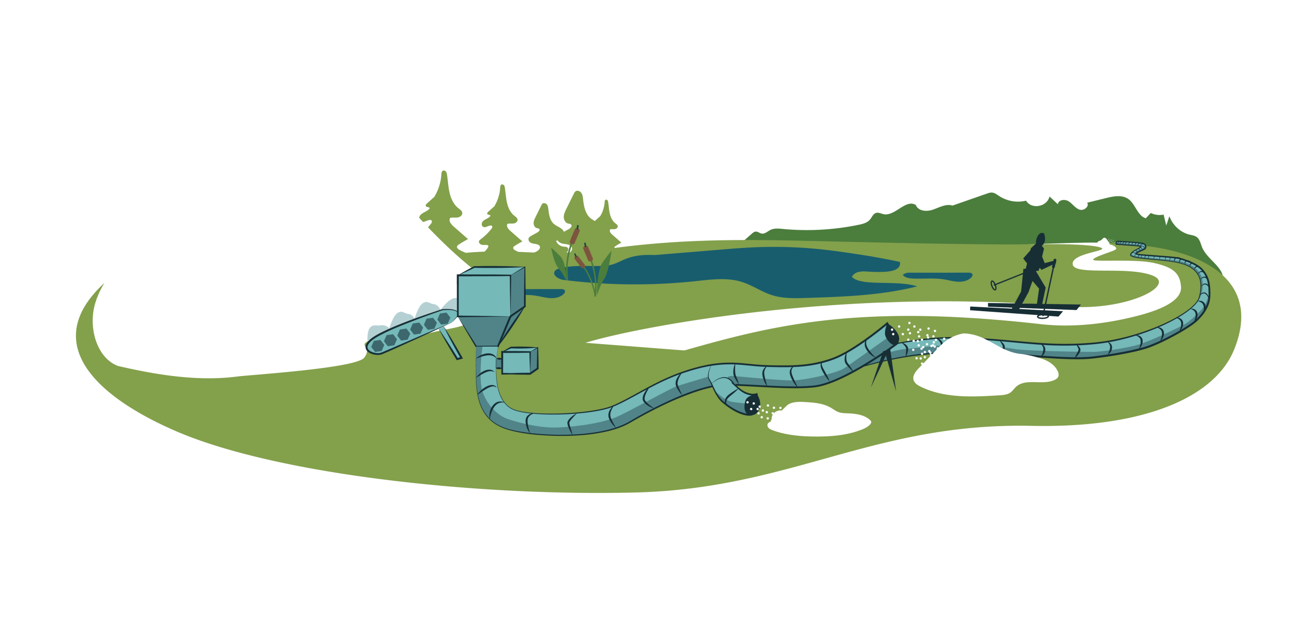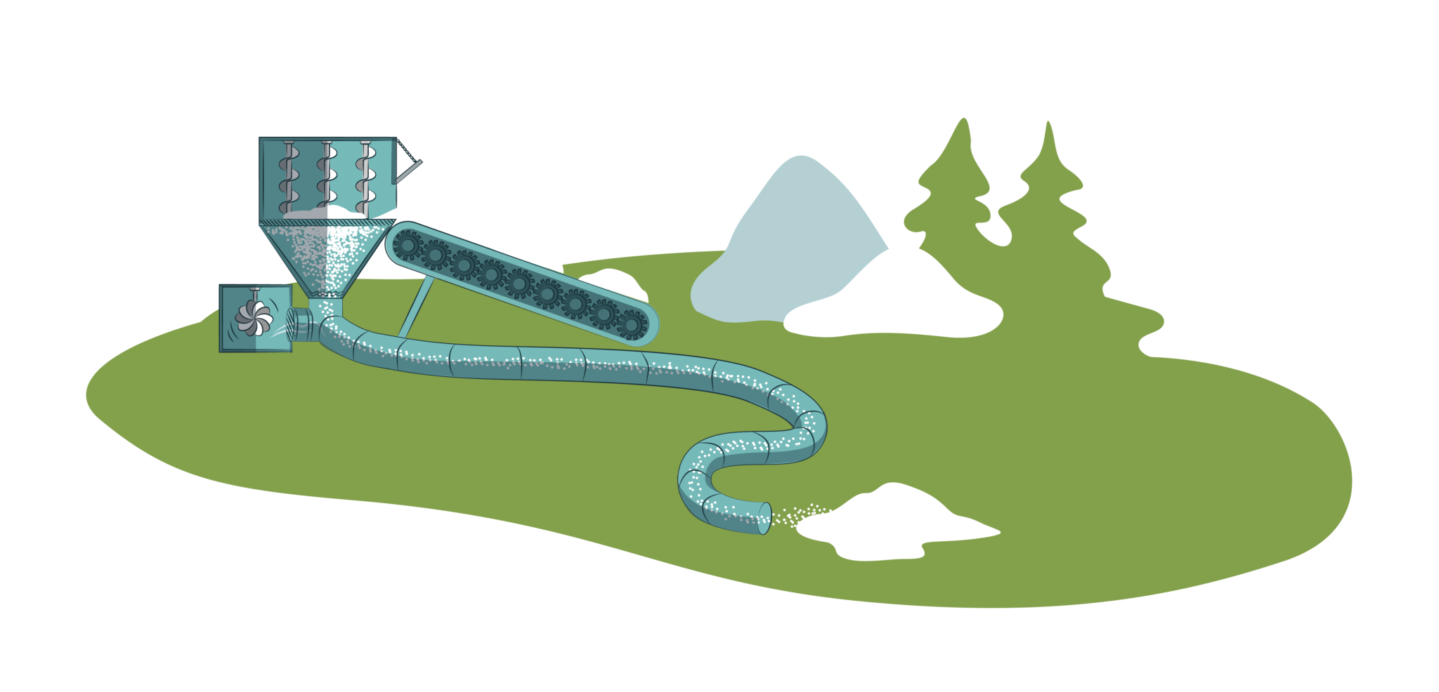 The Snow Pipe system transports snow that is fed into the machine via a conveyor belt and into a crusher. The crusher breaks snow and ice into fine-grained snow, which is then funneled into the transport pipe through a feeder. Inside the pipe, the snow is carried to the desired location in the trails or slopes.